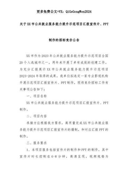 【七哥公文】2025年:关于XX市公共就业服务能力提升示范项目汇报宣传片、PPT制作的招标竞价公告+更多免费公文+VX:QiGeGongWen2024+更多免费公文+VX:QiGeGongWen2024