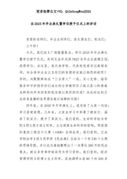 【七哥公文】2025年:在2025年毕业典礼暨学位授予仪式上的讲话+更多免费公文+VX:QiGeGongWen2024+更多免费公文+VX:QiGeGongWen2024