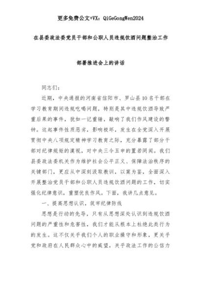 【七哥公文】2025年:在县委政法委党员干部和公职人员违规饮酒问题整治工作部署推进会上的讲话+更多免费公文+VX:QiGeGongWen2024+更多免费公文+VX:QiGeGongWen2024