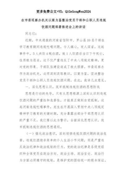 【七哥公文】2025年:在市委巡察办机关以案为鉴整治党员干部和公职人员违规饮酒问题部署推进会上的讲话+更多免费公文+VX:QiGeGongWen2024+更多免费公文+VX:QiGeGongWen2024