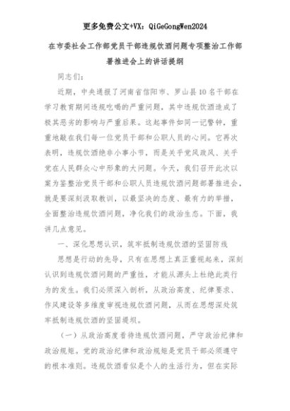 【七哥公文】2025年:在市委社会工作部党员干部违规饮酒问题专项整治工作部署推进会上的讲话提纲+更多免费公文+VX:QiGeGongWen2024+更多免费公文+VX:QiGeGongWen2024