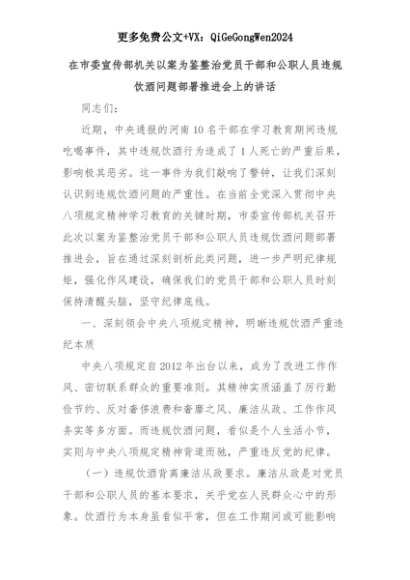 【七哥公文】2025年:在市委宣传部机关以案为鉴整治党员干部和公职人员违规饮酒问题部署推进会上的讲话+更多免费公文+VX:QiGeGongWen2024+更多免费公文+VX:QiGeGongWen2024