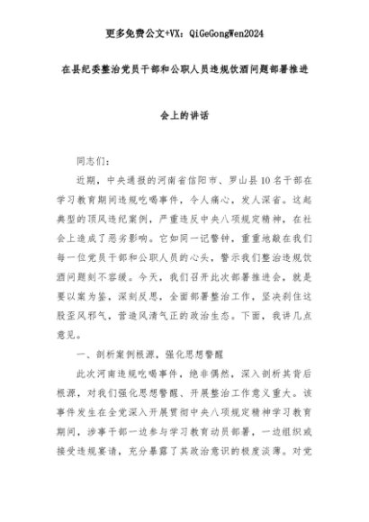 【七哥公文】2025年:在县纪委整治党员干部和公职人员违规饮酒问题部署推进会上的讲话+更多免费公文+VX:QiGeGongWen2024+更多免费公文+VX:QiGeGongWen2024
