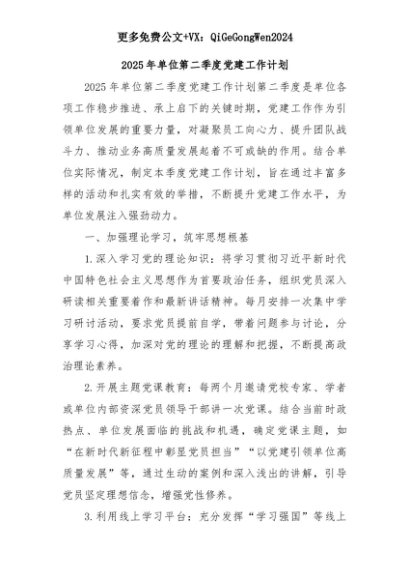 【七哥公文】2025年:2025年单位第二季度党建工作计划+更多免费公文+VX:QiGeGongWen2024+更多免费公文+VX:QiGeGongWen2024