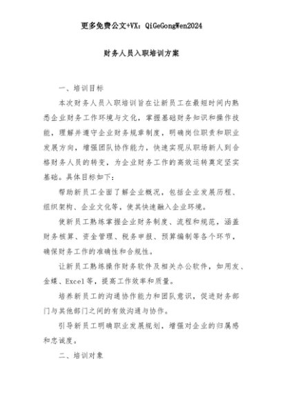 【七哥公文】2025年:财务人员入职培训方案+更多免费公文+VX:QiGeGongWen2024+更多免费公文+VX:QiGeGongWen2024