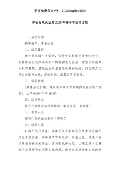 【七哥公文】2025年:综合行政执法局2025年端午节活动方案+更多免费公文+VX:QiGeGongWen2024+更多免费公文+VX:QiGeGongWen2024
