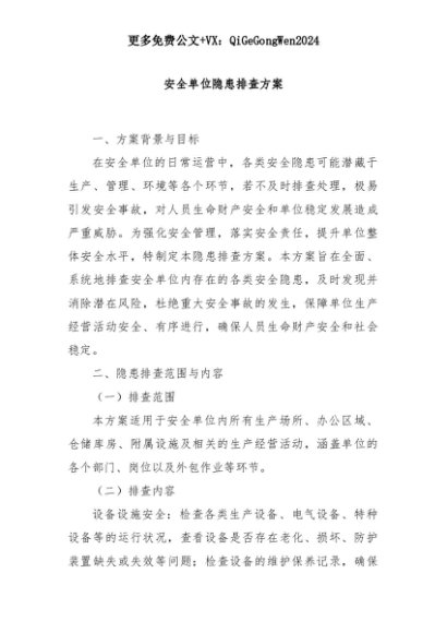 【七哥公文】2025年:安全单位隐患排查方案+更多免费公文+VX:QiGeGongWen2024+更多免费公文+VX:QiGeGongWen2024