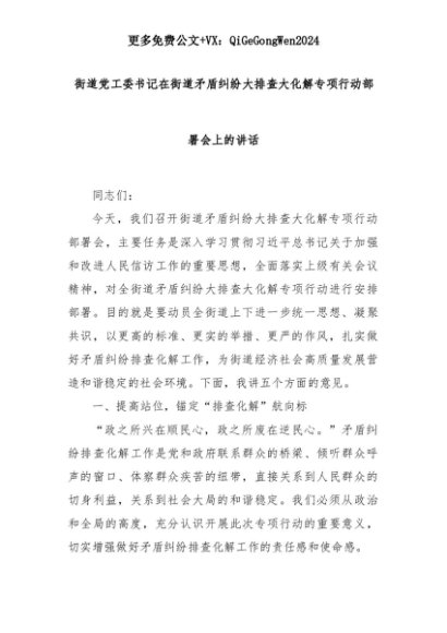 【七哥公文】2025年:街道党工委书记在街道矛盾纠纷大排查大化解专项行动部署会上的讲话+更多免费公文+VX:QiGeGongWen2024+更多免费公文+VX:QiGeGongWen2024