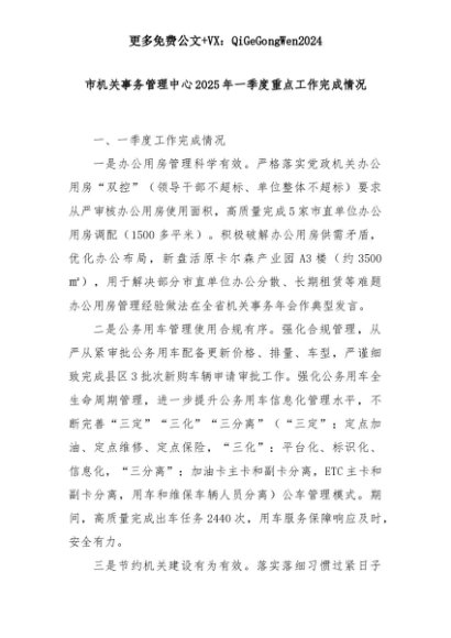 【七哥公文】2025年:市机关事务管理中心2025年一季度重点工作完成情况+更多免费公文+VX:QiGeGongWen2024+更多免费公文+VX:QiGeGongWen2024