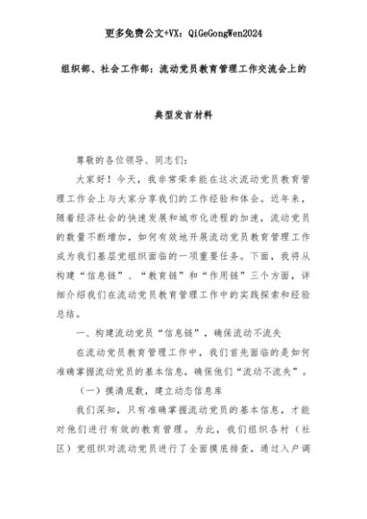 【七哥公文】2025年:组织部、社会工作部:流动党员教育管理工作交流会上的典型发言材料+更多免费公文+VX:QiGeGongWen2024+更多免费公文+VX:QiGeGongWen2024