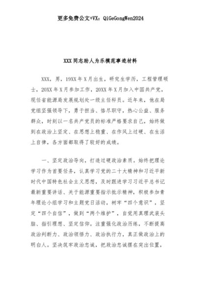 【七哥公文】2025年:XXX同志助人为乐模范事迹材料(省能源局发展规划处一级主任科员)+更多免费公文+VX:QiGeGongWen2024+更多免费公文+VX:QiGeGongWen2024