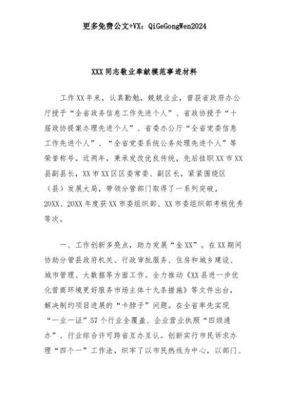 【七哥公文】2025年:XXX同志敬业奉献模范事迹材料(副区长)+更多免费公文+VX:QiGeGongWen2024+更多免费公文+VX:QiGeGongWen2024