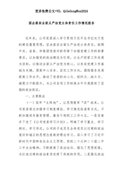 【七哥公文】2025年:国企落实全面从严治党主体责任工作情况报告+更多免费公文+VX:QiGeGongWen2024+更多免费公文+VX:QiGeGongWen2024
