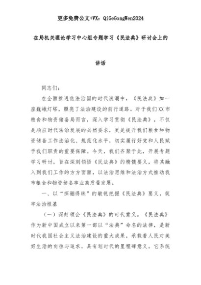 【七哥公文】2025年:在局机关理论学习中心组专题学习《民法典》研讨会上的讲话+更多免费公文+VX:QiGeGongWen2024+更多免费公文+VX:QiGeGongWen2024