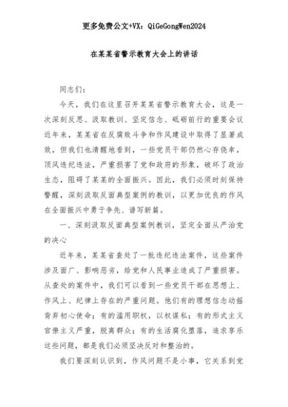 【七哥公文】2025年:在某某省警示教育大会上的讲话+更多免费公文+VX:QiGeGongWen2024+更多免费公文+VX:QiGeGongWen2024