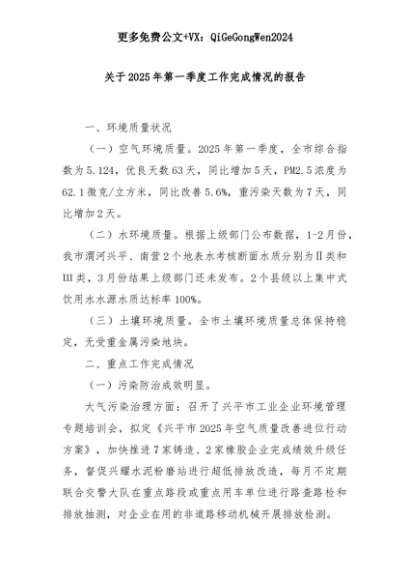 【七哥公文】2025年:关于2025年第一季度工作完成情况的报告+更多免费公文+VX:QiGeGongWen2024+更多免费公文+VX:QiGeGongWen2024
