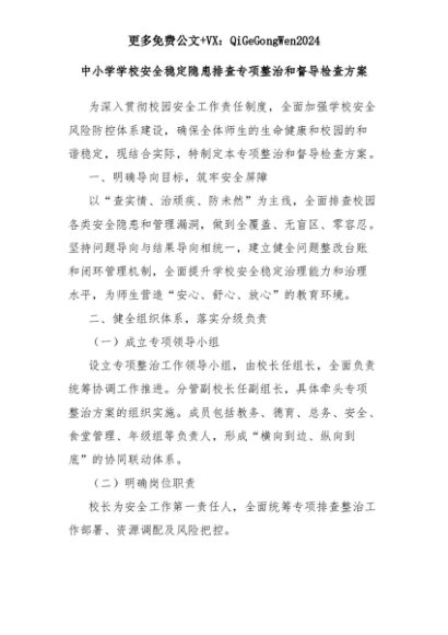 【七哥公文】2025年:中小学学校安全稳定隐患排查专项整治和督导检查方案+更多免费公文+VX:QiGeGongWen2024+更多免费公文+VX:QiGeGongWen2024