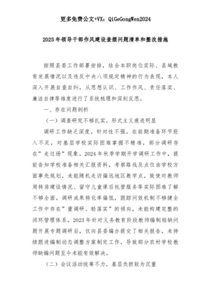 【七哥公文】2025年:2025年领导干部作风建设查摆问题清单和整改措施+更多免费公文+VX:QiGeGongWen2024+更多免费公文+VX:QiGeGongWen2024