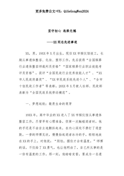 【七哥公文】2025年:XXX同志先进事迹材料(市殡仪馆技工)+更多免费公文+VX:QiGeGongWen2024+更多免费公文+VX:QiGeGongWen2024