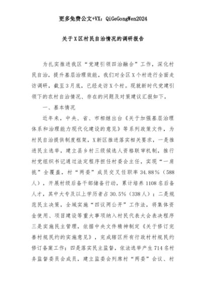 【七哥公文】2025年:关于X区村民自治情况的调研报告+更多免费公文+VX:QiGeGongWen2024+更多免费公文+VX:QiGeGongWen2024