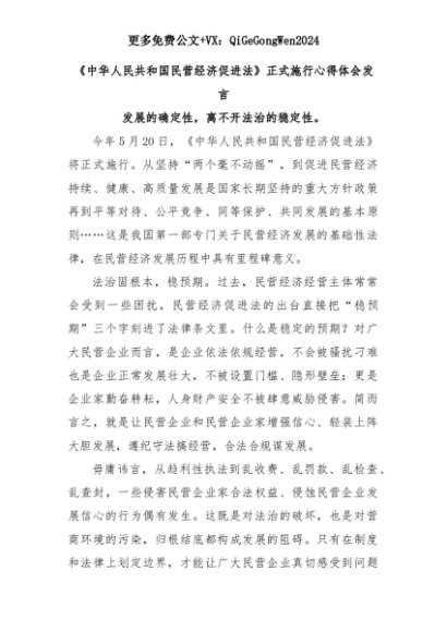 【七哥公文】2025年:《中华人民共和国民营经济促进法》正式施行心得体会发言+更多免费公文+VX:QiGeGongWen2024+更多免费公文+VX:QiGeGongWen2024