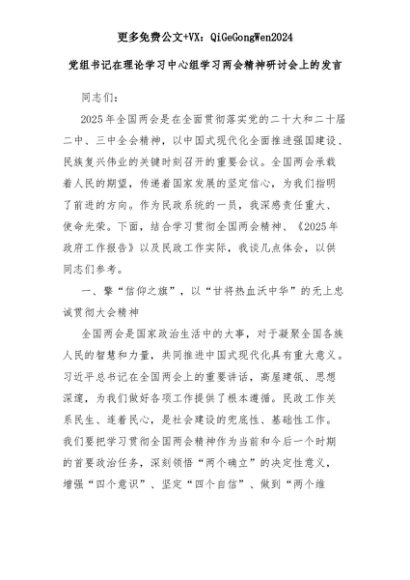 【七哥公文】2025年:党组书记在理论学习中心组学习两会精神研讨会上的发言+更多免费公文+VX:QiGeGongWen2024+更多免费公文+VX:QiGeGongWen2024