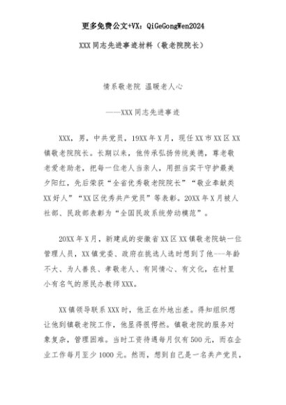 【七哥公文】2025年:XXX同志先进事迹材料(敬老院院长)+更多免费公文+VX:QiGeGongWen2024+更多免费公文+VX:QiGeGongWen2024