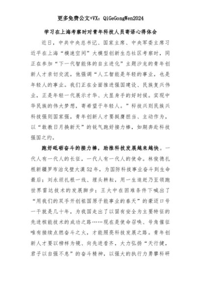 【七哥公文】2025年:学习在上海考察时对青年科技人员寄语心得体会+更多免费公文+VX:QiGeGongWen2024+更多免费公文+VX:QiGeGongWen2024
