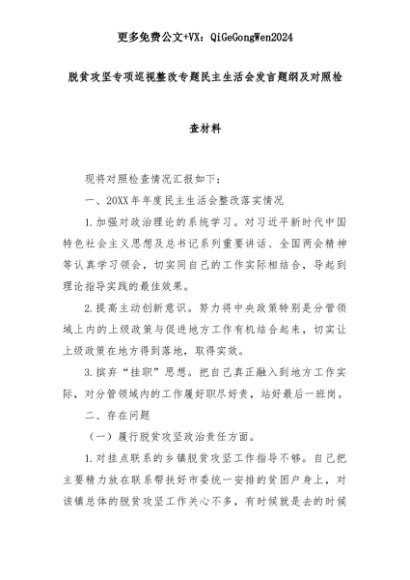 【七哥公文】2025年:脱贫攻坚专项巡视整改专题民主生活会发言题纲及对照检查材料+更多免费公文+VX:QiGeGongWen2024+更多免费公文+VX:QiGeGongWen2024