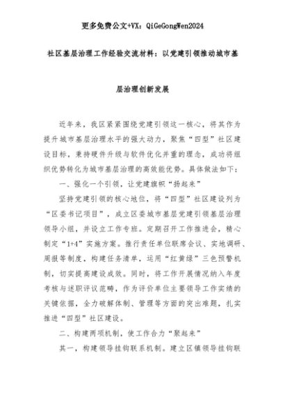 【七哥公文】2025年:社区基层治理工作经验交流材料:以党建引领推动城市基层治理创新发展+更多免费公文+VX:QiGeGongWen2024+更多免费公文+VX:QiGeGongWen2024