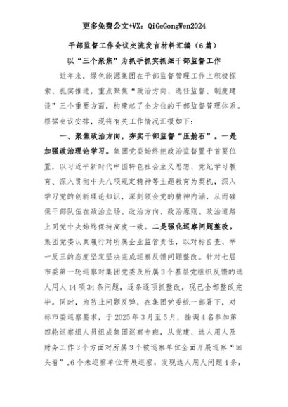 【七哥公文】2025年:(6篇)干部监督工作会议交流发言材料汇编+更多免费公文+VX:QiGeGongWen2024+更多免费公文+VX:QiGeGongWen2024