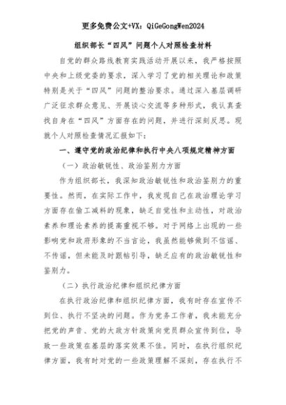 【七哥公文】2025年:组织部长“四风”问题个人对照检查材料+更多免费公文+VX:QiGeGongWen2024+更多免费公文+VX:QiGeGongWen2024