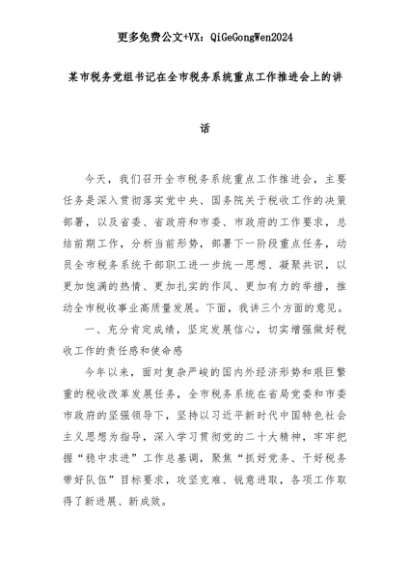 【七哥公文】2025年:某市税务党组书记在全市税务系统重点工作推进会上的讲话+更多免费公文+VX:QiGeGongWen2024+更多免费公文+VX:QiGeGongWen2024