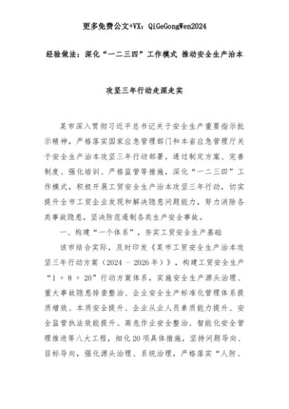【七哥公文】2025年:经验做法:深化“一二三四”工作模式 推动安全生产治本攻坚三年行动走深走实+更多免费公文+VX:QiGeGongWen2024+更多免费公文+VX:QiGeGongWen2024