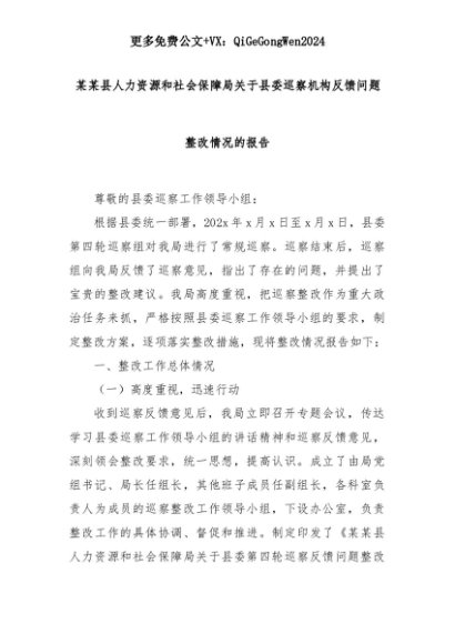 【七哥公文】2025年:某某县人力资源和社会保障局关于县委巡察机构反馈问题整改情况的报告+更多免费公文+VX:QiGeGongWen2024+更多免费公文+VX:QiGeGongWen2024