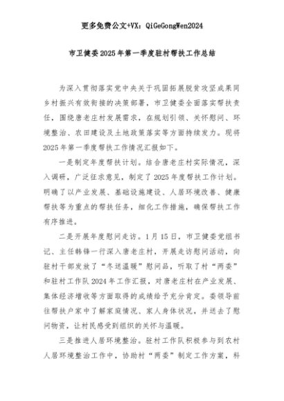 【七哥公文】2025年:市卫健委2025年第一季度驻村帮扶工作总结+更多免费公文+VX:QiGeGongWen2024+更多免费公文+VX:QiGeGongWen2024