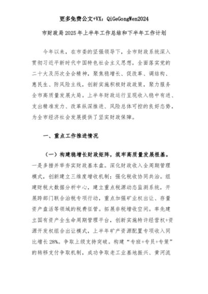 【七哥公文】2025年:市财政局2025年上半年工作总结和下半年工作计划+更多免费公文+VX:QiGeGongWen2024+更多免费公文+VX:QiGeGongWen2024