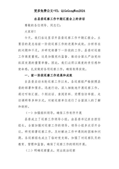【七哥公文】2025年:在县委巡察工作中期汇报会上的讲话+更多免费公文+VX:QiGeGongWen2024+更多免费公文+VX:QiGeGongWen2024