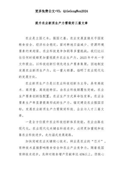 【七哥公文】2025年:提升农业新质生产力需做好三篇文章+更多免费公文+VX:QiGeGongWen2024+更多免费公文+VX:QiGeGongWen2024