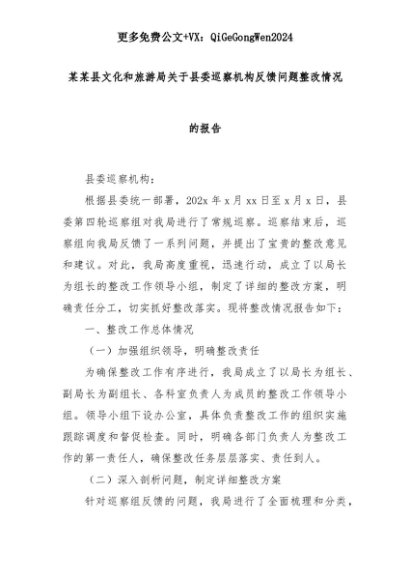 【七哥公文】2025年:某某县文化和旅游局关于县委巡察机构反馈问题整改情况的报告+更多免费公文+VX:QiGeGongWen2024+更多免费公文+VX:QiGeGongWen2024