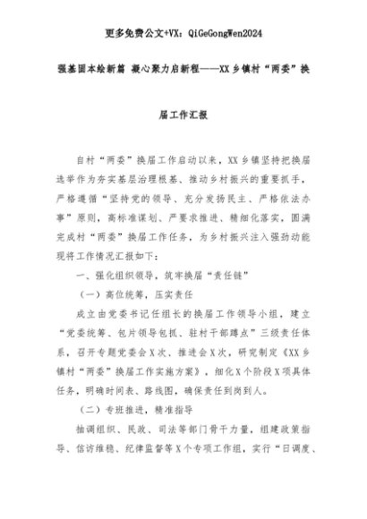 【七哥公文】2025年:强基固本绘新篇 凝心聚力启新程——XX乡镇村“两委”换届工作汇报+更多免费公文+VX:QiGeGongWen2024+更多免费公文+VX:QiGeGongWen2024