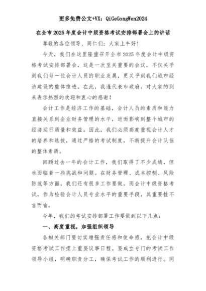 【七哥公文】2025年:在全市2025年度会计中级资格考试安排部署会上的讲话+更多免费公文+VX:QiGeGongWen2024+更多免费公文+VX:QiGeGongWen2024