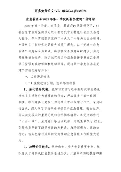 【七哥公文】2025年:应急管理局2025年第一季度抓基层党建工作总结+更多免费公文+VX:QiGeGongWen2024+更多免费公文+VX:QiGeGongWen2024