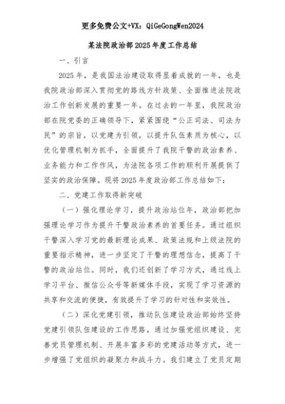 【七哥公文】2025年:某法院政治部2025年度工作总结+更多免费公文+VX:QiGeGongWen2024+更多免费公文+VX:QiGeGongWen2024