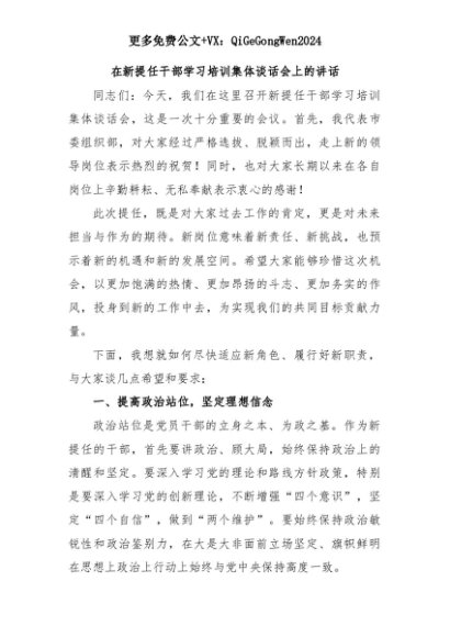 【七哥公文】2025年:在新提任干部学习培训集体谈话会上的讲话+更多免费公文+VX:QiGeGongWen2024+更多免费公文+VX:QiGeGongWen2024