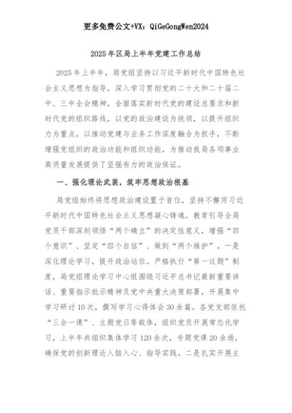 【七哥公文】2025年:2025年区局上半年党建工作总结+更多免费公文+VX:QiGeGongWen2024+更多免费公文+VX:QiGeGongWen2024