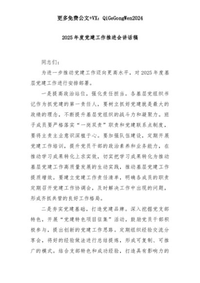 【七哥公文】2025年:2025年度党建工作推进会讲话稿+更多免费公文+VX:QiGeGongWen2024+更多免费公文+VX:QiGeGongWen2024