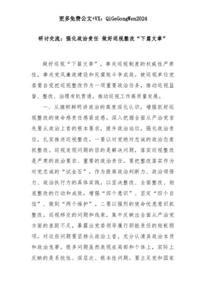 【七哥公文】2025年:研讨交流:强化政治责任 做好巡视整改“下篇文章”+更多免费公文+VX:QiGeGongWen2024+更多免费公文+VX:QiGeGongWen2024