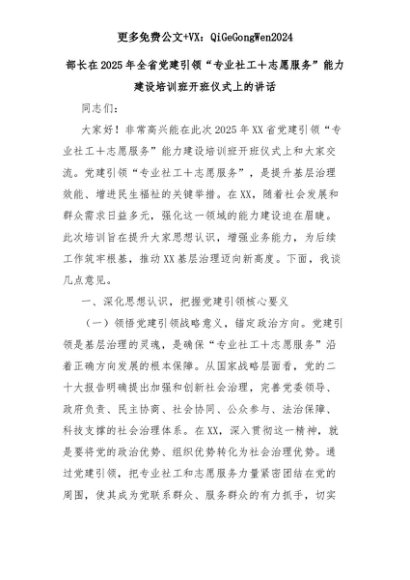 【七哥公文】2025年:部长在2025年全省党建引领“专业社工+志愿服务”能力建设培训班开班仪式上的讲话+更多免费公文+VX:QiGeGongWen2024+更多免费公文+VX:QiGeGongWen2024