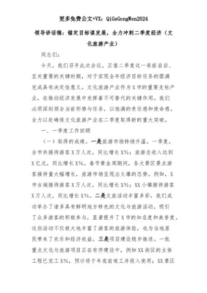 【七哥公文】2025年:领导讲话稿:锚定目标谋发展,全力冲刺二季度经济(文化旅游产业)+更多免费公文+VX:QiGeGongWen2024+更多免费公文+VX:QiGeGongWen2024